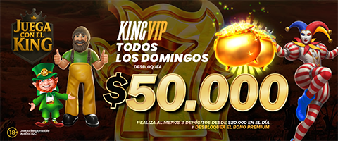 ¡Todos los Domingos completa las 3 misiones del King depositando desde $20.000 y desbloquea automáticamente un Bono Premium de $50.000!