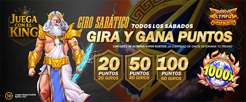 Todos los Sábados el King te da tres oportunidades para sumar puntos apostando en los juegos más pagadores. ¡Recarga, gira en el horario indicado y acumula puntos!