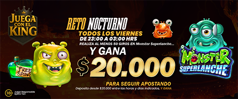 El King te premia por jugar de noche: Deposita desde $20.000, realiza 50 giros en Monster Superlanche y recibe un bono gratis para seguir apostando.