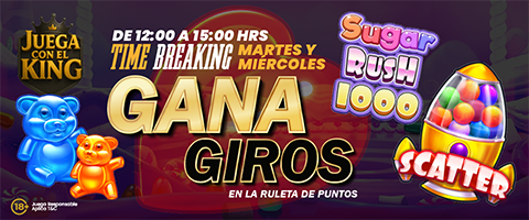 El King te premia en tu break todos los Martes y Miércoles: Recarga $15.000, juega 20 giros en Sugar Rush 1000 y desbloquea un giro en la Ruleta de Puntos para sumar más y canjear grandes premios.